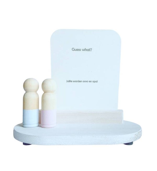 Breng nieuws op een originele manier via een kraslotje. Leuk gepresenteerd op een houten staander, vergezeld van een pegdoll.